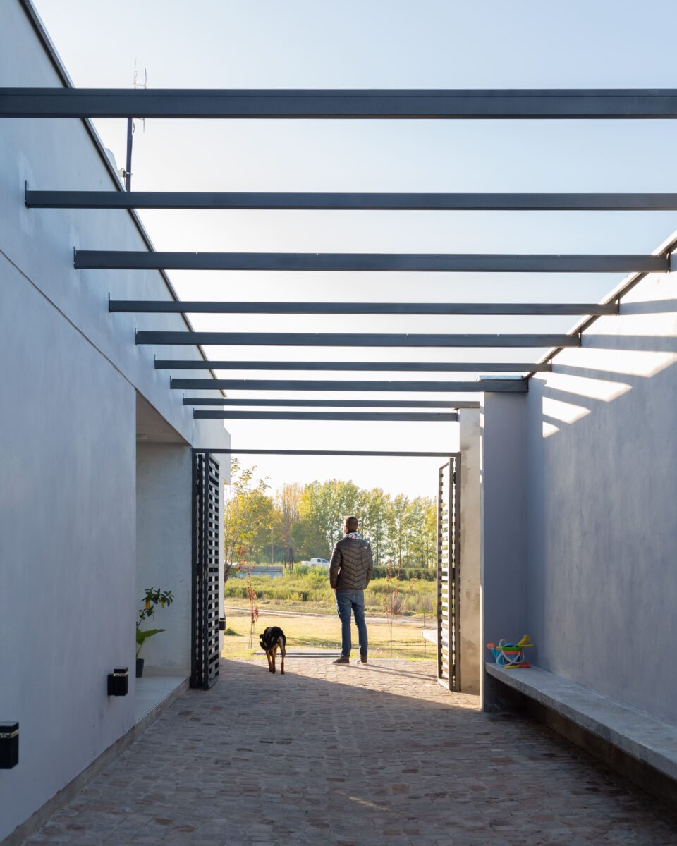 Desde el principio el proyecto plantea la experiencia sensorial como principal objetivo. El ingreso, que está conformado por un paseo arbolado ("avenida de los ciruelos") hace las veces de pequeño atrio, confluyendo en un hall semi-cubierto, unión de todas las partes. Hasta ese momento la casa se presenta como un sólido impenetrable, al abrir la puerta de acceso todo cambia, la visual se amplia casi infinitamente y lo lejano se hace cercano, se presentan constantes vistas enmarcadas hacia el gran jardín.