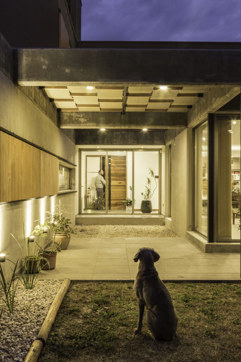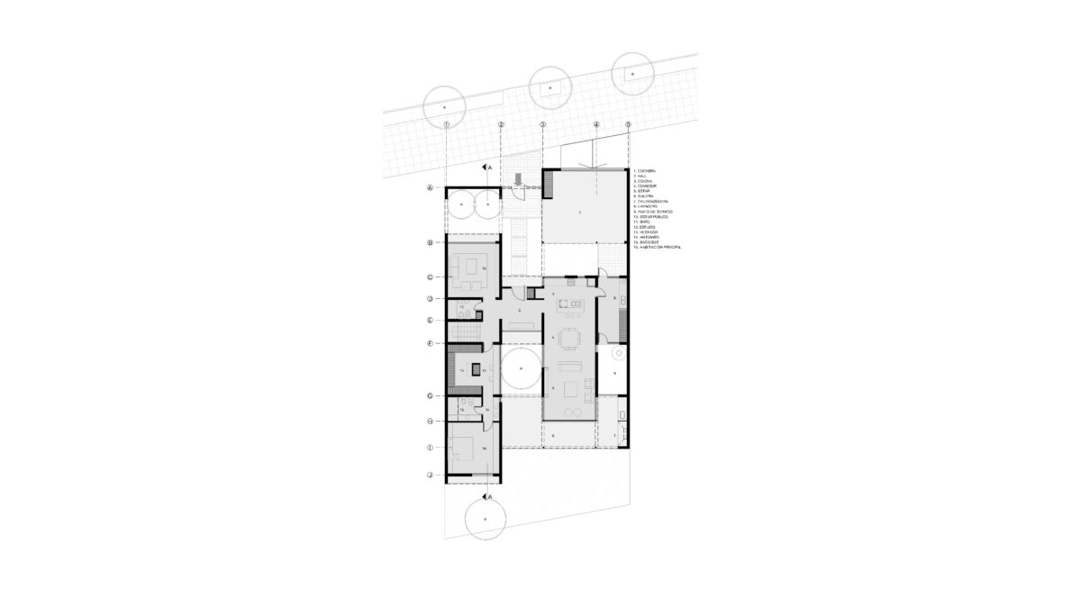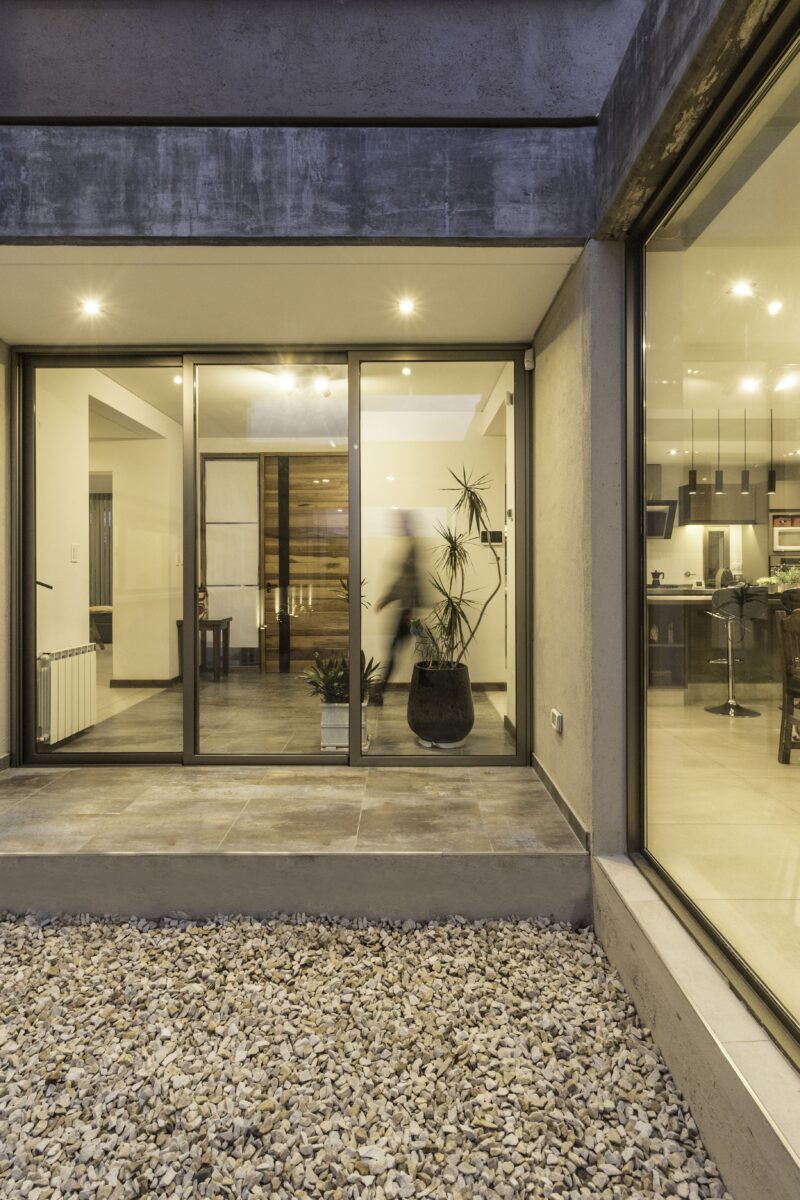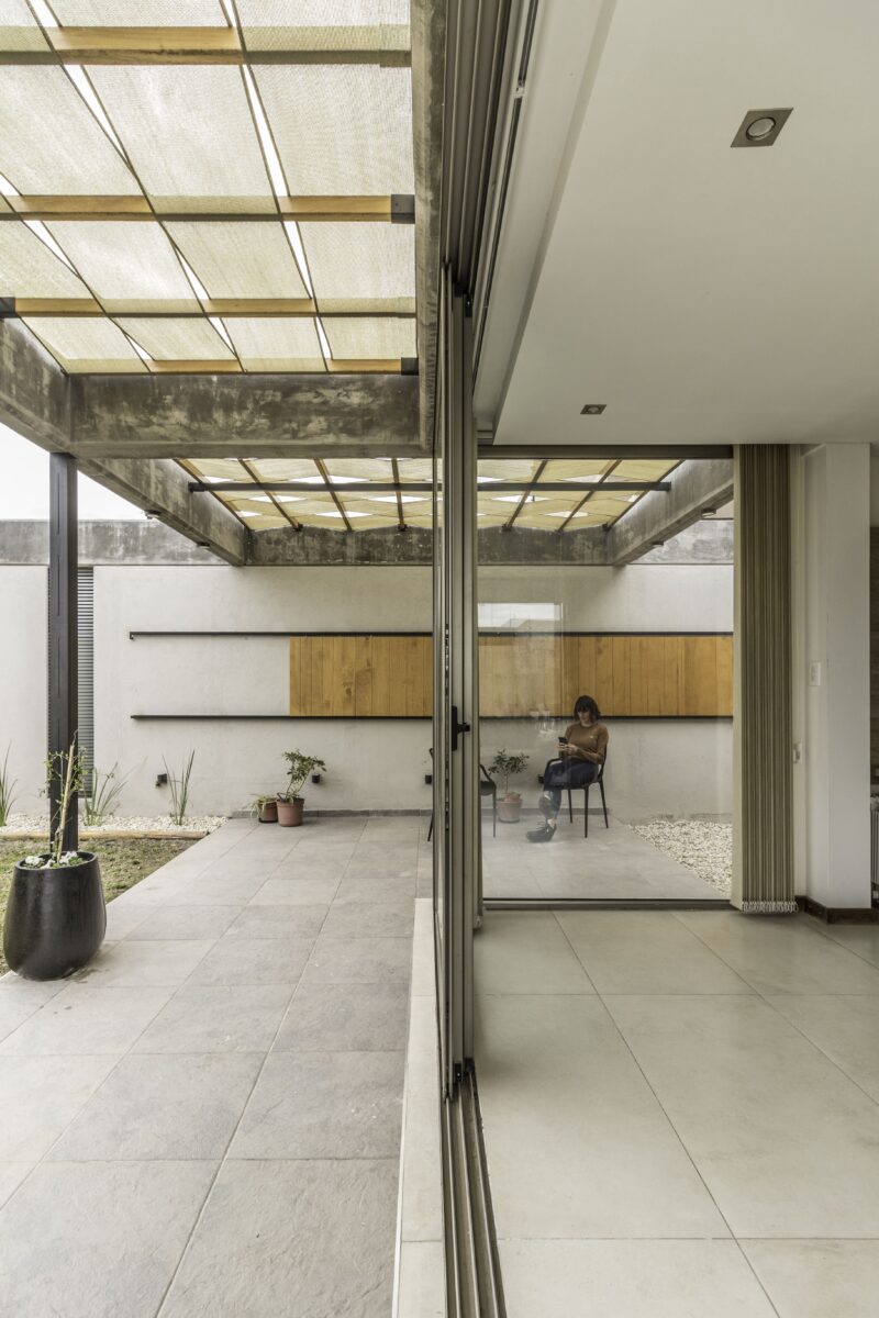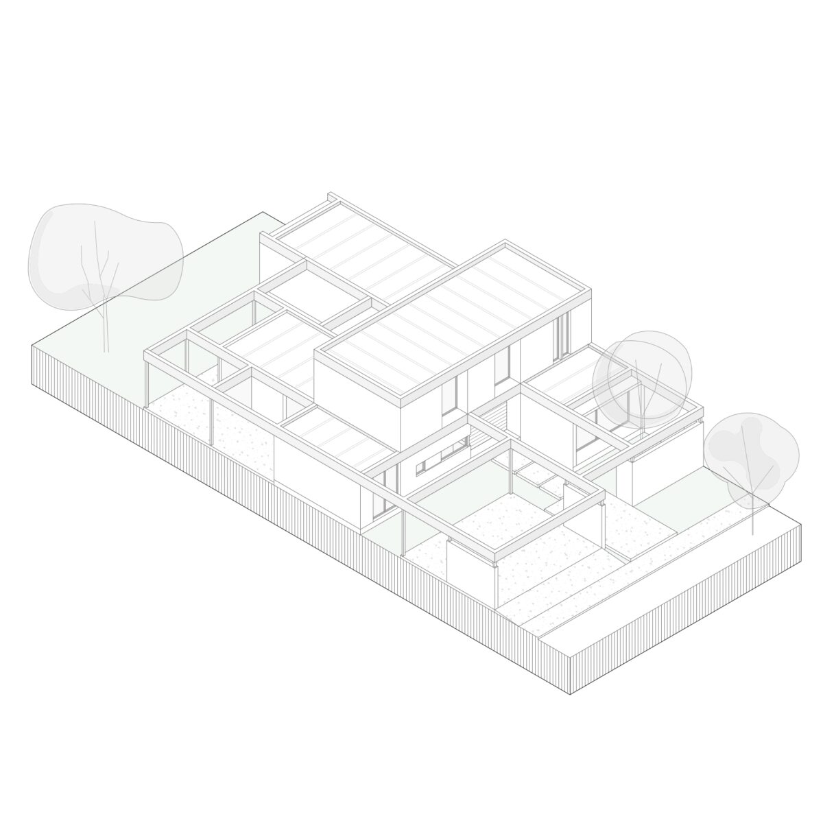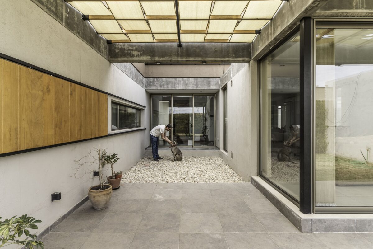 En este damero se definen llenos y vacíos que se entrelazan en una suerte de tablero de ajedrez, en el que siempre un espacio interior está acompañado de uno exterior. De este modo, desde el acceso hasta la expansión se convive en constante contacto con el patio.