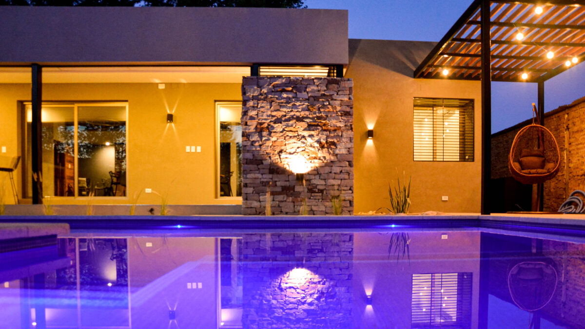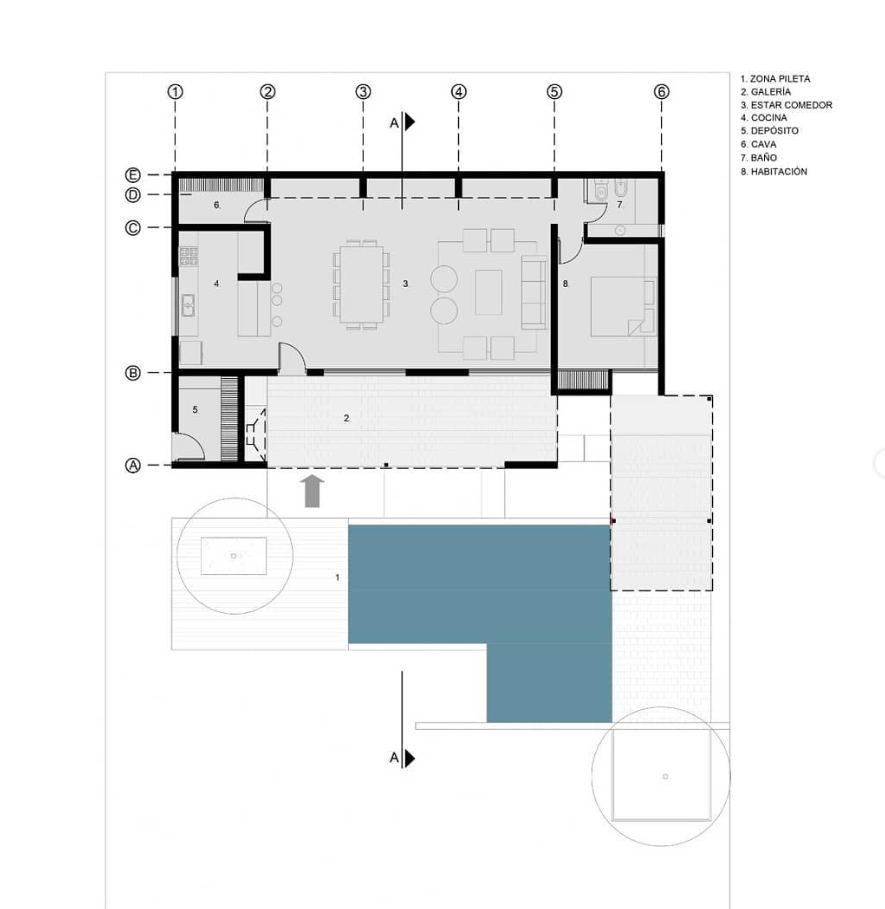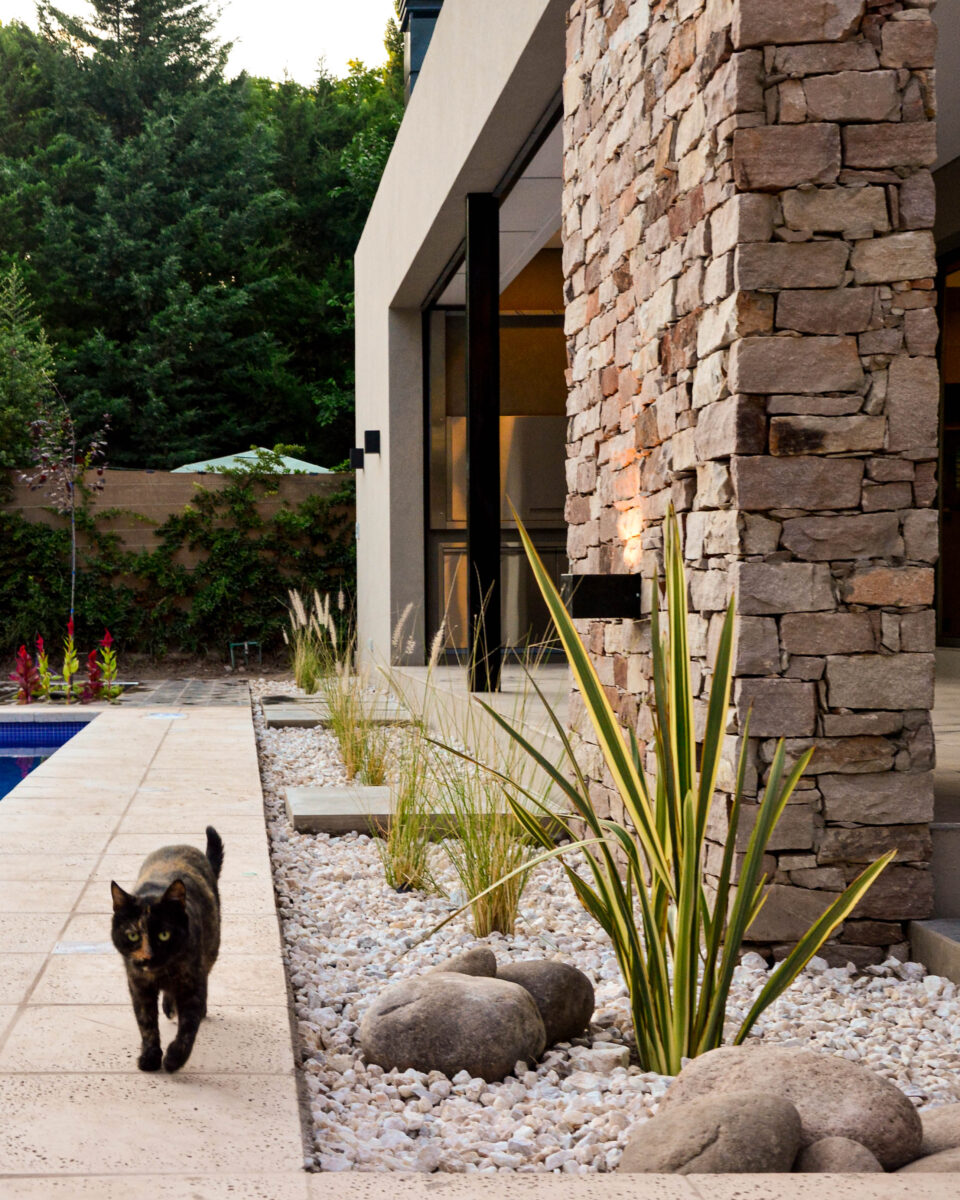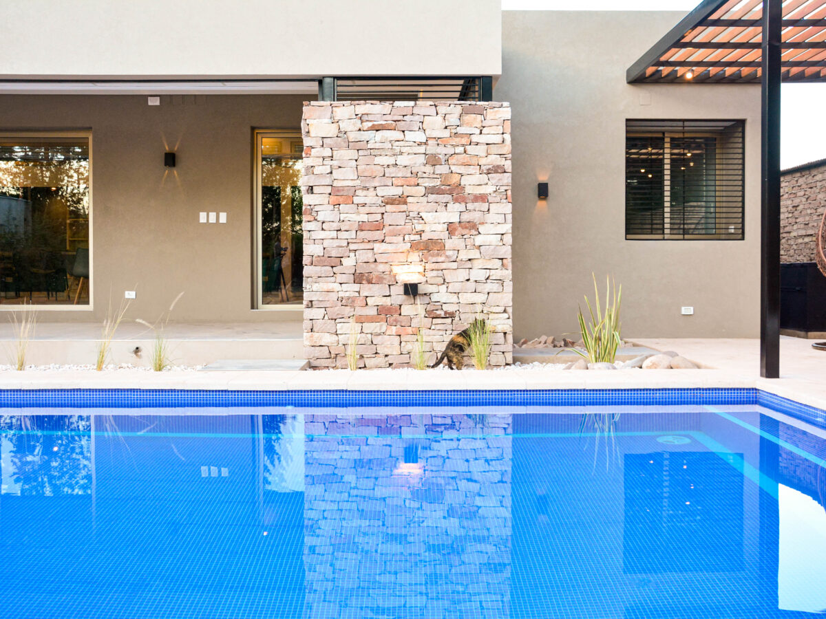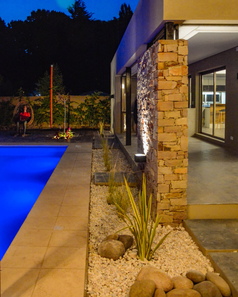 La pileta, como corazón del jardín se encuentra rodeada por un conjunto de espacios resueltos con distintos tratamientos de pisos y cubiertas, creando así diversas sensaciones en cada uno ellos, pero participando todos del mismo ámbito.