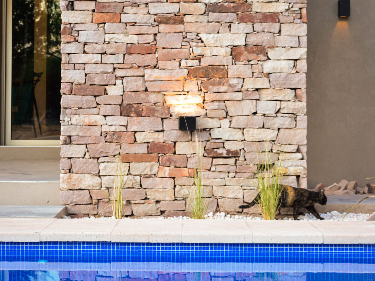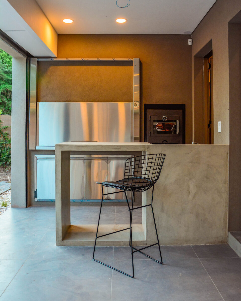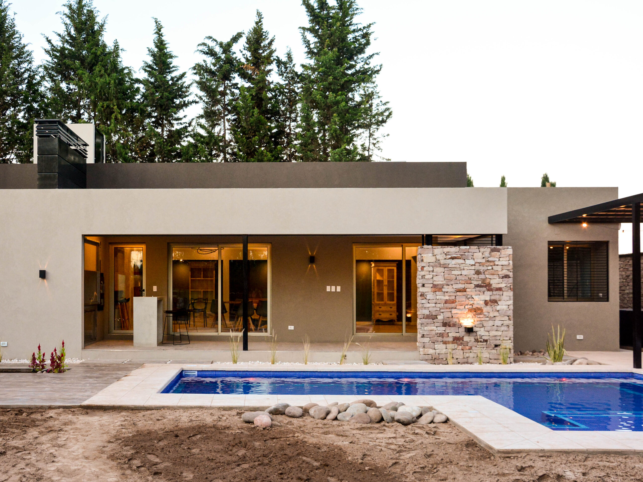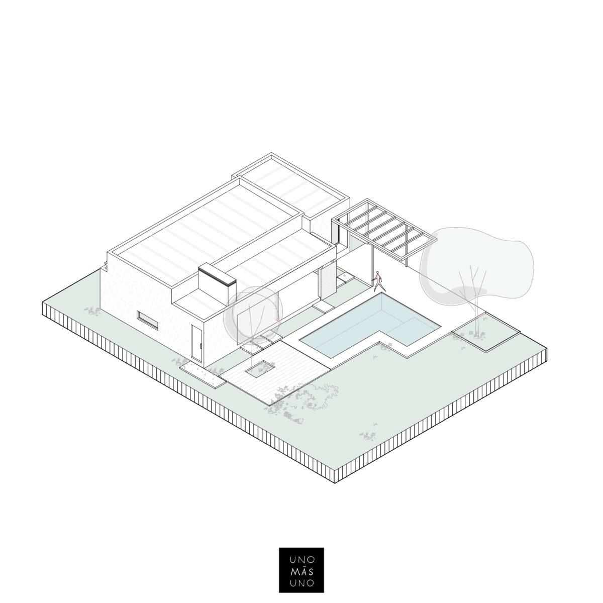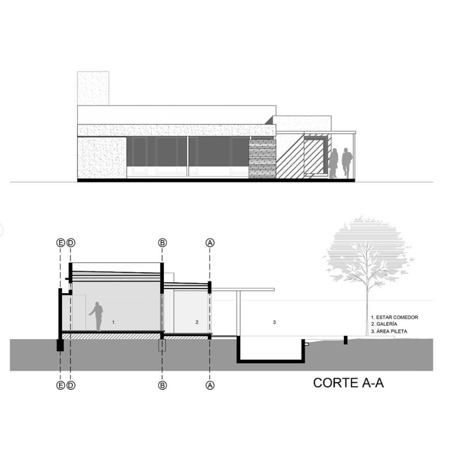 La pileta, como corazón del jardín se encuentra rodeada por un conjunto de espacios resueltos con distintos tratamientos de pisos y cubiertas, creando así diversas sensaciones en cada uno ellos, pero participando todos del mismo ámbito.
