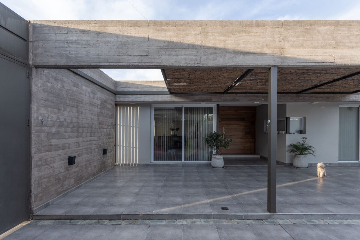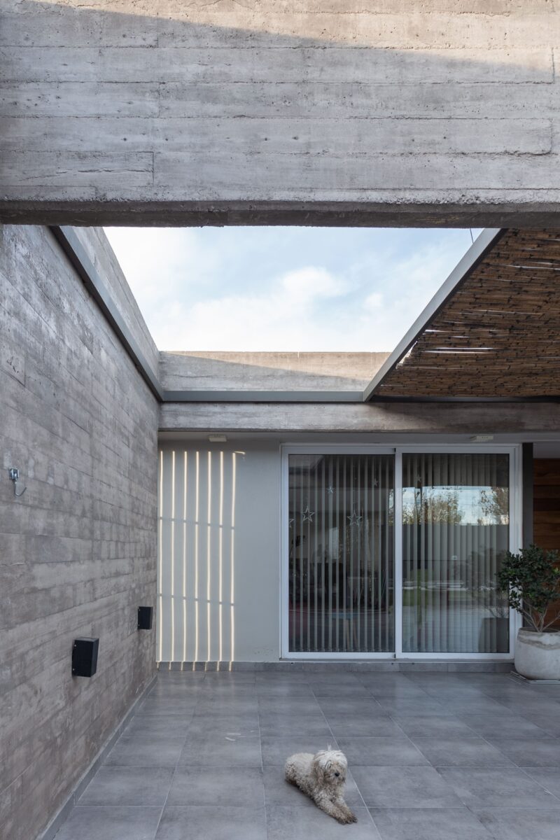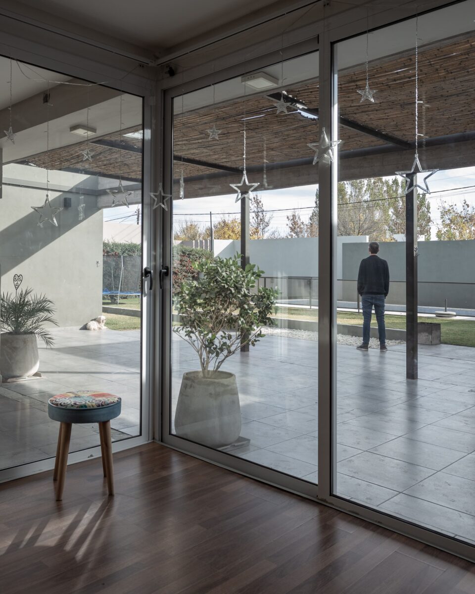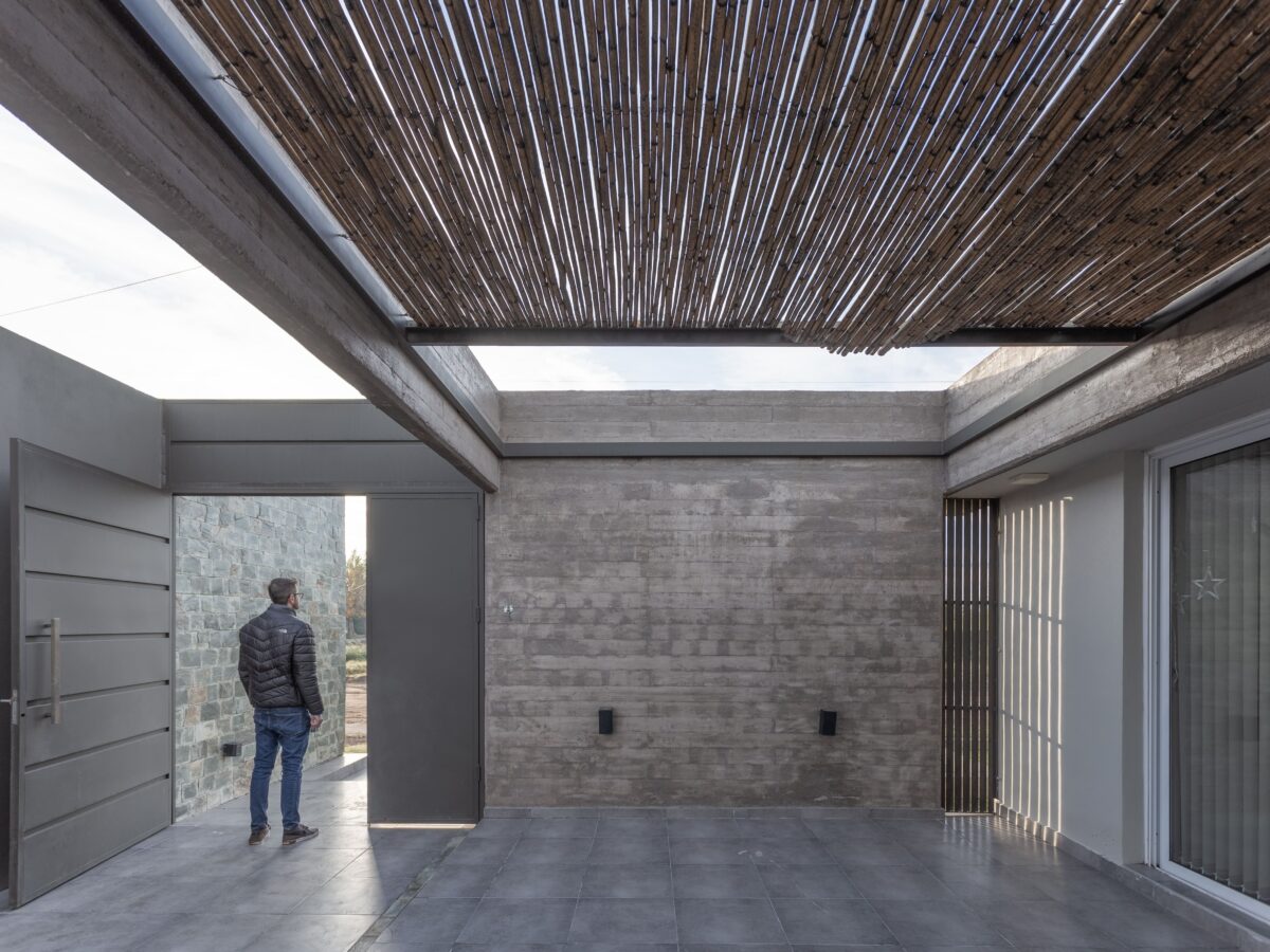 Del mismo modo la casa se divide este-oeste, ubicando en la primera orientación el espacio diurno en relación con la calle y al oeste la zona de habitaciones. A su vez ambos sectores de desfasan conformando un galería en el sector público limitada por la propia arquitectura y cubierta por una pérgola de cañas que genera una agradable luz tamizada.