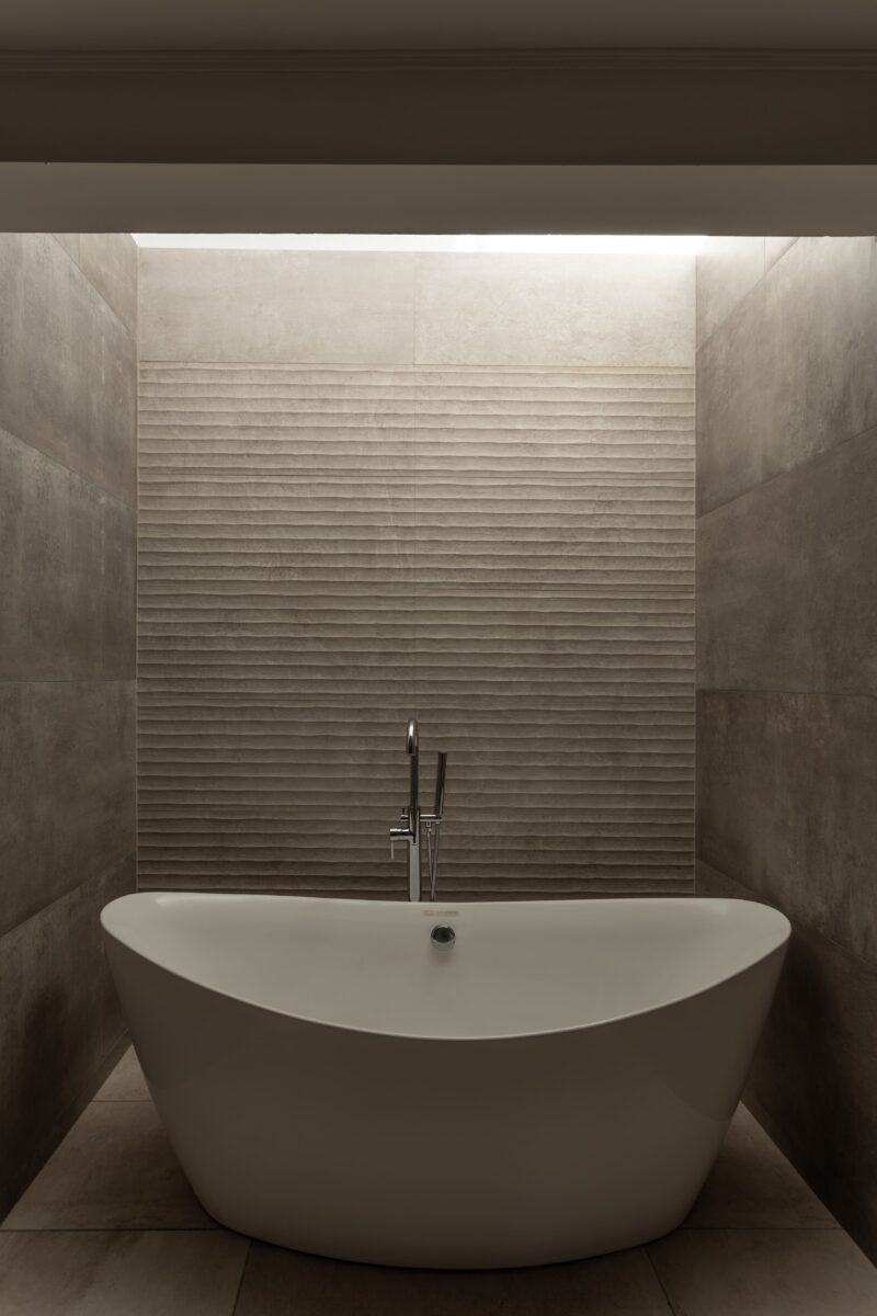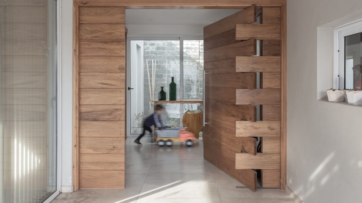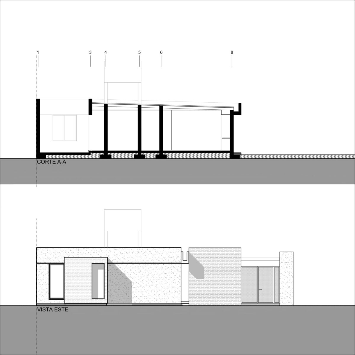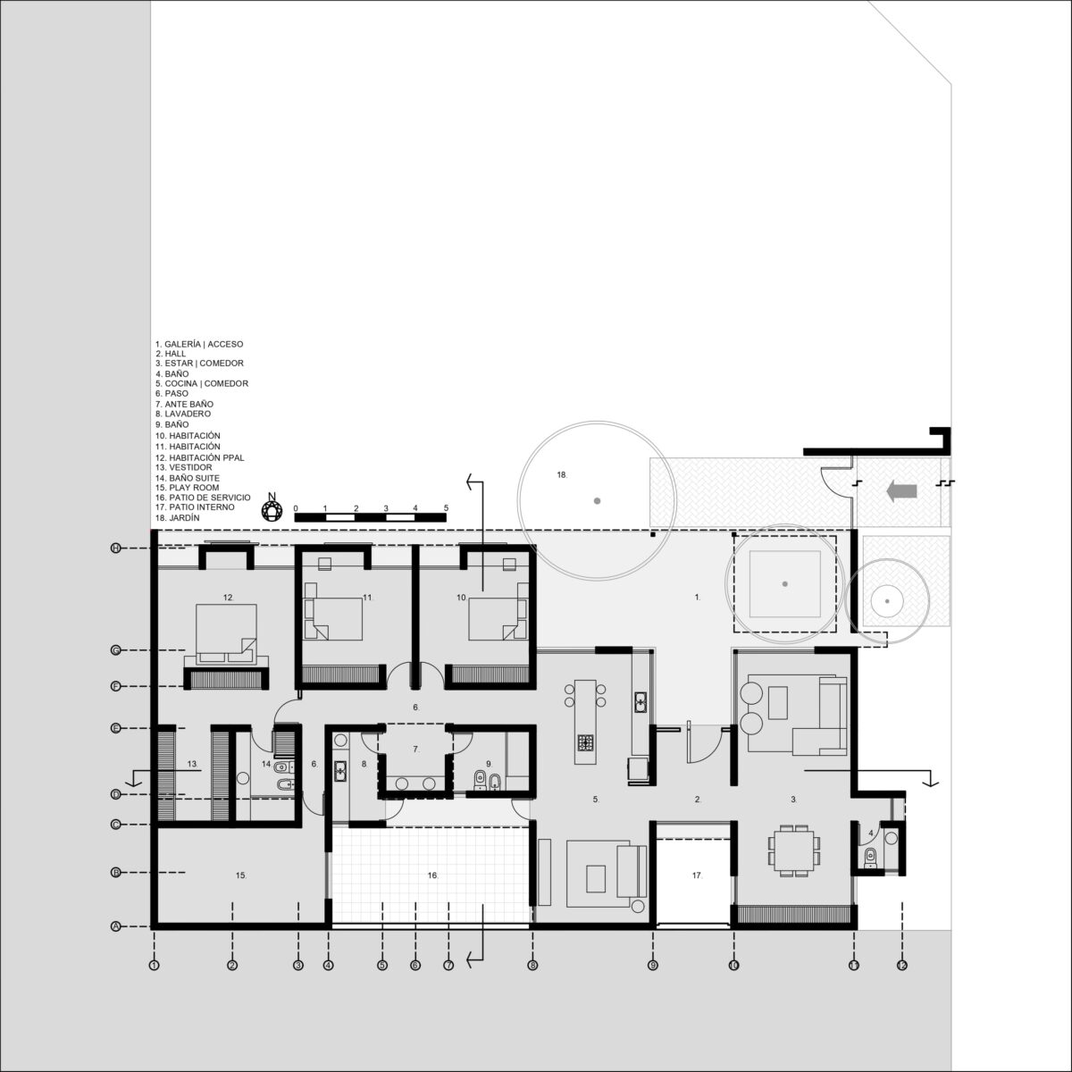 Del mismo modo la casa se divide este-oeste, ubicando en la primera orientación el espacio diurno en relación con la calle y al oeste la zona de habitaciones. A su vez ambos sectores de desfasan conformando un galería en el sector público limitada por la propia arquitectura y cubierta por una pérgola de cañas que genera una agradable luz tamizada.