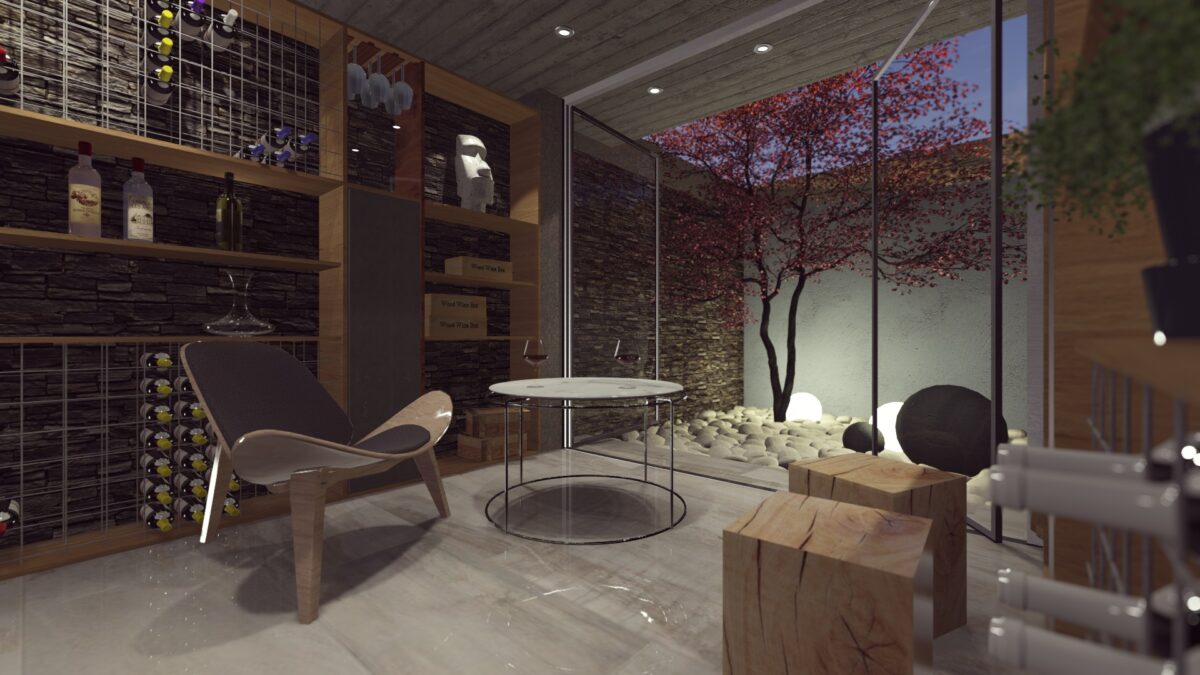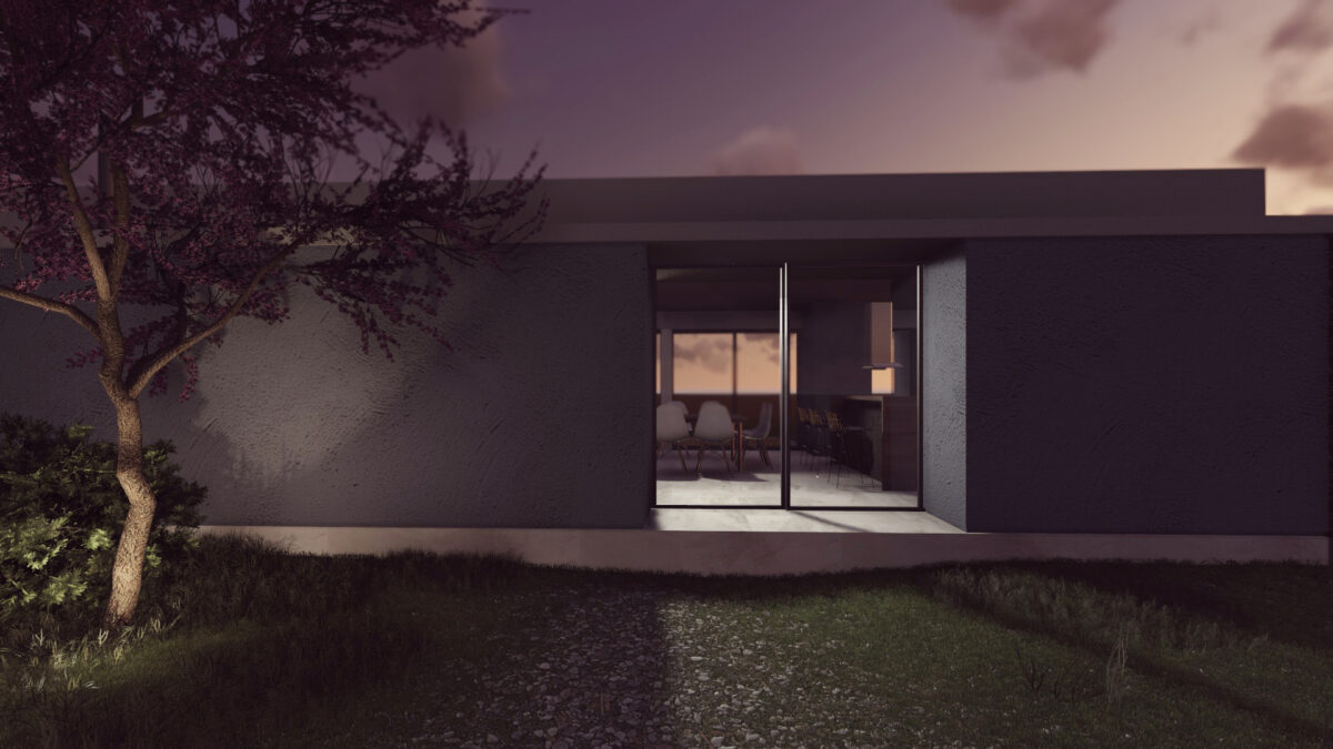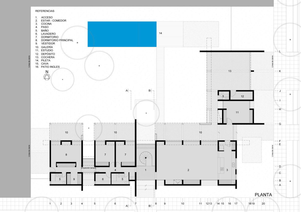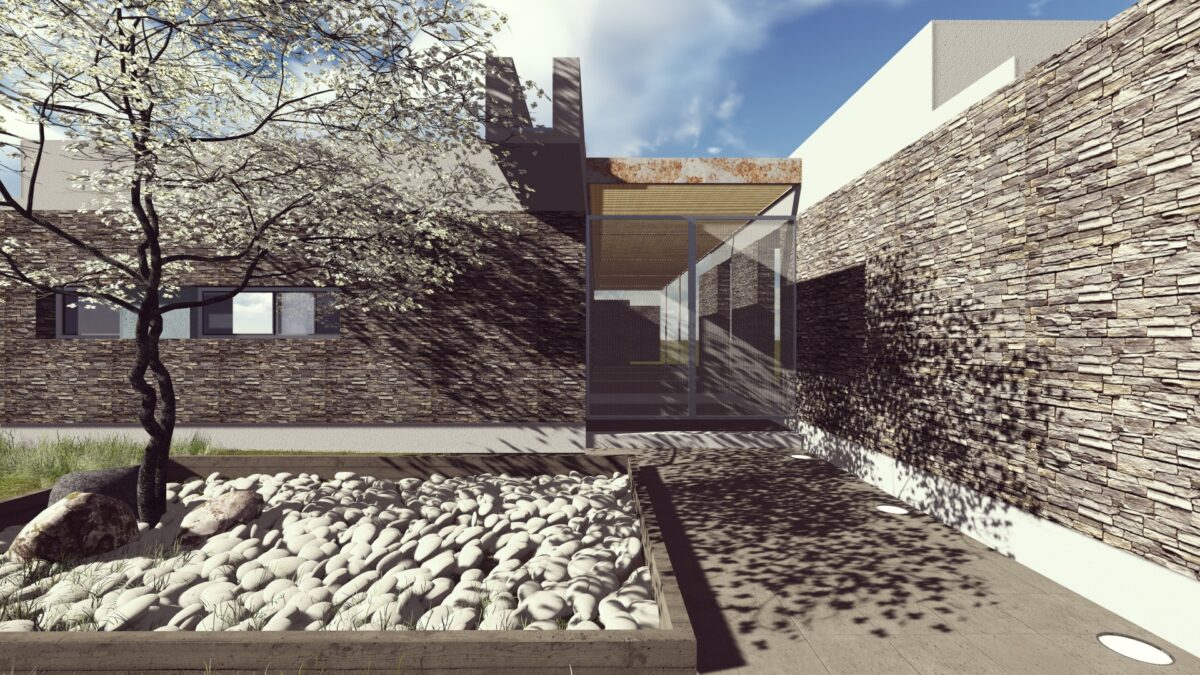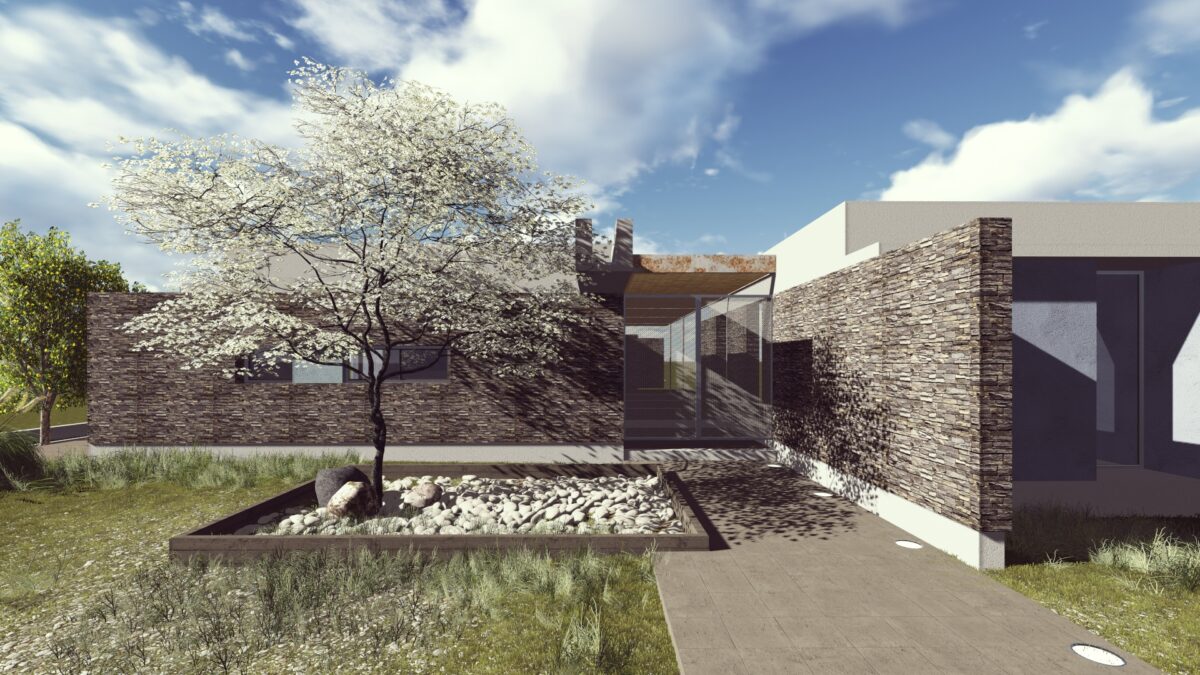 En una gran esquina, un gran volumen conforma un sólido límite entre la calle y el parque. Este se fisura construye y permite la conexión entre el exterior y el interior. El límite entre las partes queda definido por la construcción de muros de piedra que evidencian dicha ruptura. La galería, como elemento vinculante, sostiene la sutil relación entre las partes y el espacio intermedio entre la casa y el jardín.