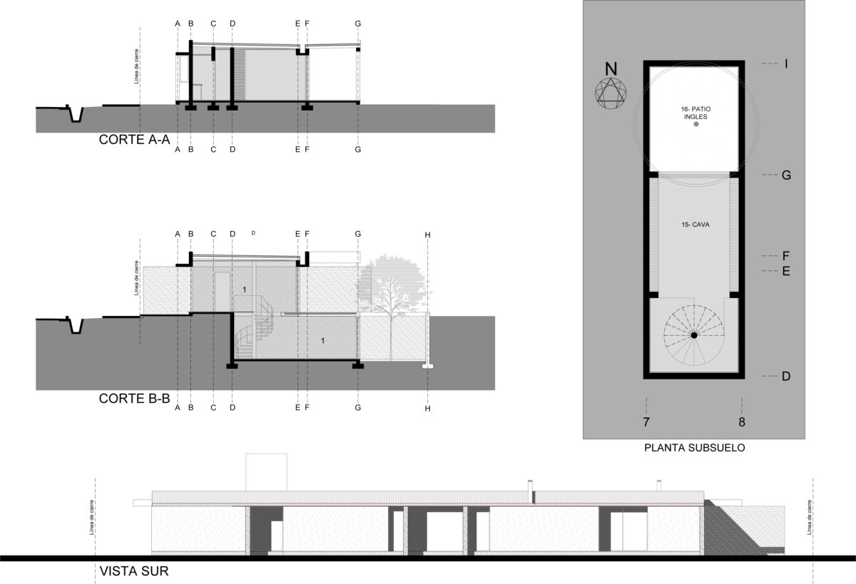Una de las incisuras se convierte en acceso y divide la casa en dos ámbitos principales, uno público y uno privado; además, socava el suelo y crea la cava.